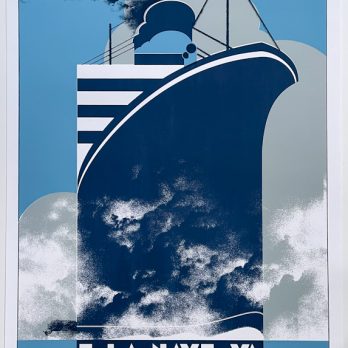 The design emphasizes graphic contrast and atmospheric weight. A massive steamship occupies the center of the composition, rendered in stark geometric black, cutting into a cloud-saturated sky. Using layered halftone textures and minimalist colorwork, Sotolongo evokes the surreal tone of Fellini’s film without relying on literal figuration. The result is a restrained yet cinematic image that bridges auteur cinema and screen-printed poster art.