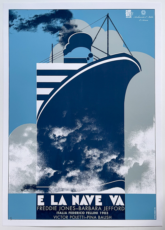 This E La Nave Va film poster carries forward that tradition, situating graphic design as a space of critical and poetic engagement with film. Sotolongo distills Fellini’s vision into an image that stands on its own as a work of contemporary art.