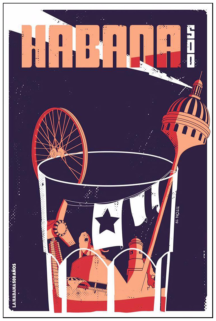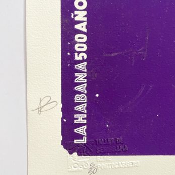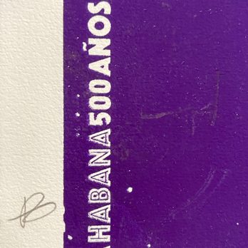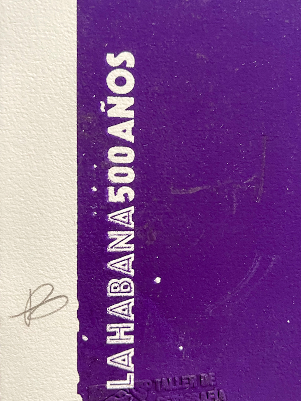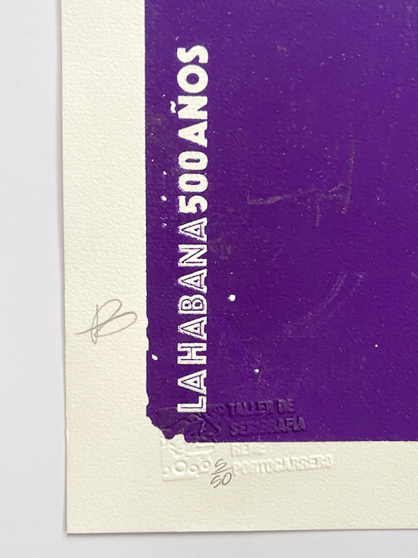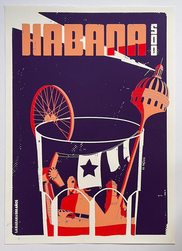 The Havana 500 Anniversary poster is a hand-signed, dry-stamped, and numbered silkscreen print (serigraph) by Daniel ‘Tito’ Quintana, presented unlined and in excellent condition. Now based in Miami, Quintana was born and raised in Cuba and studied architecture at the Technological University of Havana (CUJAE). His work brings together architectural research and graphic design, resulting in a critical and interdisciplinary approach to imagemaking.